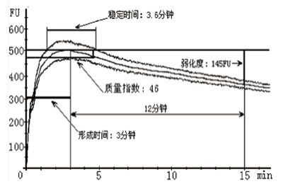• 稳定时间 粉质曲线的上边沿与500FU 标线两次相交的时间间隔,单位:分钟